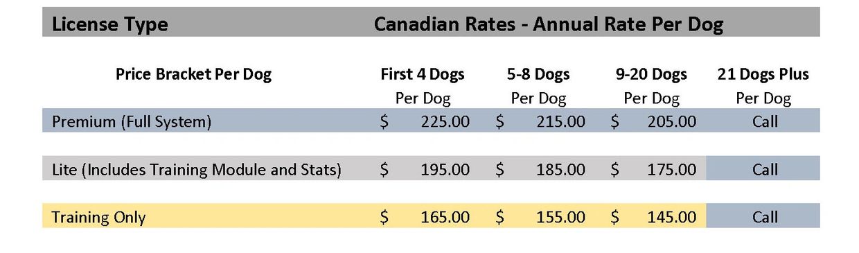 Price Brackets: Note that the above Matrix is broken down in price brackets and is a price per dog annually. The cost comes down as the number of dogs increases and you move into the next bracket.