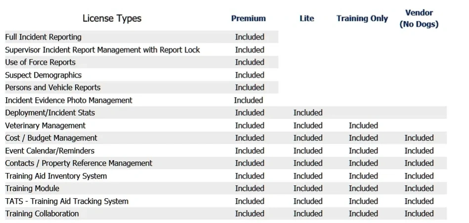 KATS provides your agency additional users at no additional charge. Supervisors and other administrators required are free. You are only charged for the number of dogs you have in the system. System administrators can add as many users who have supervisory responsibility or other need to access the system at no additional cost. When a dog retires or passes away, KATS affords you the ability to mark that dog as inactive, which will allow you to add a new dog at no additional cost, while still maintaining the ability to pull any records required for the dog that you have marked inactive. Dogs marked inactive, can no longer have information or activities entered, however all previous records are maintained.